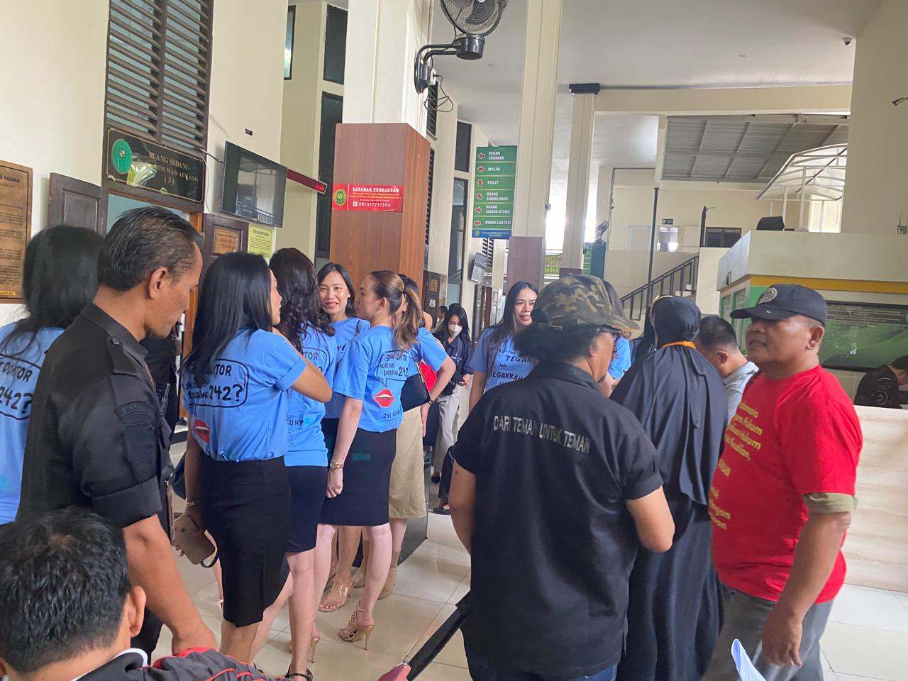 Pada saat bersamaan, di luar ruang sidang terdapat pengunjung pendukung Ike Farida yang mengenakan kaos merah dan kuning yang menyuarakan keadilan untuk Ike Farida, dan di lain pihak terdapat juga kelompok ibu-ibu cantik pendukung penegakan hukum untuk Ike Farida yang mengencakan baju biru.